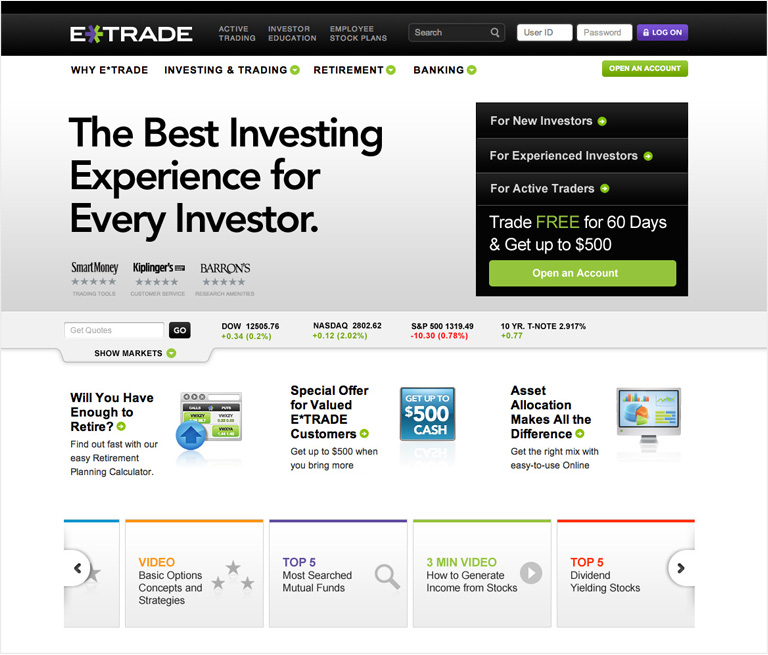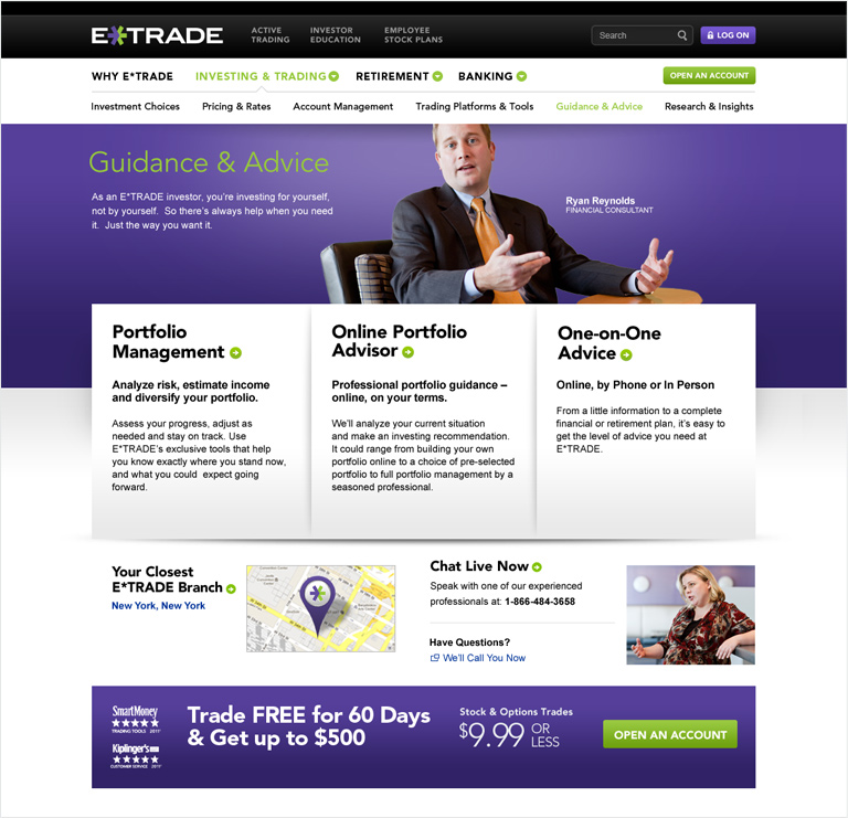 The new site supports E*TRADE’s positioning as an online investing pioneer and details the full breadth and scope of E*TRADE’s product offerings. The design process, grounded in analysis and customer research, identified key insights which drove the development of the new E*TRADE.com. The result is a site intended to enhance the customer acquisition experience, elevate E*TRADE’s positioning and product offerings, segment different audience groups and deliver original content and educational material to inspire and educate both investors and traders.